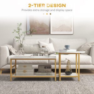 HOMCOM’s modern yet eye-catching coffee tables for the living room come in a set of two shapes. With two diverse center tables, the set is an excellent accompaniment to various spaces and home styles. Why limit yourself to just coffee, tea, and snacks? You can give your home an artistic vibe by displaying photos, books, flowers, and other decorations too. Let our two stylish yet functional storage coffee tables accompany you as a place to store and keep decor. Make your house a home with HOMCOM. Features: – Includes two coffee tables, which can be used separately or together – Bottom shelf on each table allows extra storage – Round table can also be used as a sofa side table – Faux marble tabletop with gold frame adds elegance – Painted steel frame for high stability – Adjustable foot pads keep the table balanced and protect the floor from scratches – Assembly required Specification: – Color: Gold, White – Materials: Steel, Particleboard – Overall Dimensions: 31.5″ W x 21.25″ D x 16.25″ H (Rectangle Table), 23.5″ W x 23.5″ D x 20″ H (Round Table) – Open Shelf Size: 31.25″ W x 19″ D x 11″ H (Rectangle Table), 19″ W x 11.75″ D x 15″ H (Round Table) – Bottom to Floor Height: 2.75″ H – Weight Capacity: 33 lbs. (Each Table), 22 lbs. (Top), 11 lbs. (Shelf) – Item Label: 839-766V01WT Package Includes: – 1 x Large Coffee Table – 1 x Small Coffee Table – 1 x Manual.