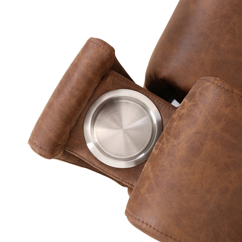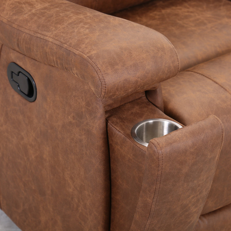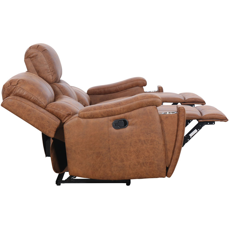 This sofa brings a vintage-inspired look to your living room or den. It is crafted from solid and engineered wood, and it features a manual reclining mechanism that lets you lean back into three different positions. This piece is upholstered in a cognac faux leather that provides a water- and stain-resistant surface for your home. It includes built-in cup holders to keep your beverages close at hand while you relax. We also love how the square arms and split back design offer a tailored silhouette for your space.