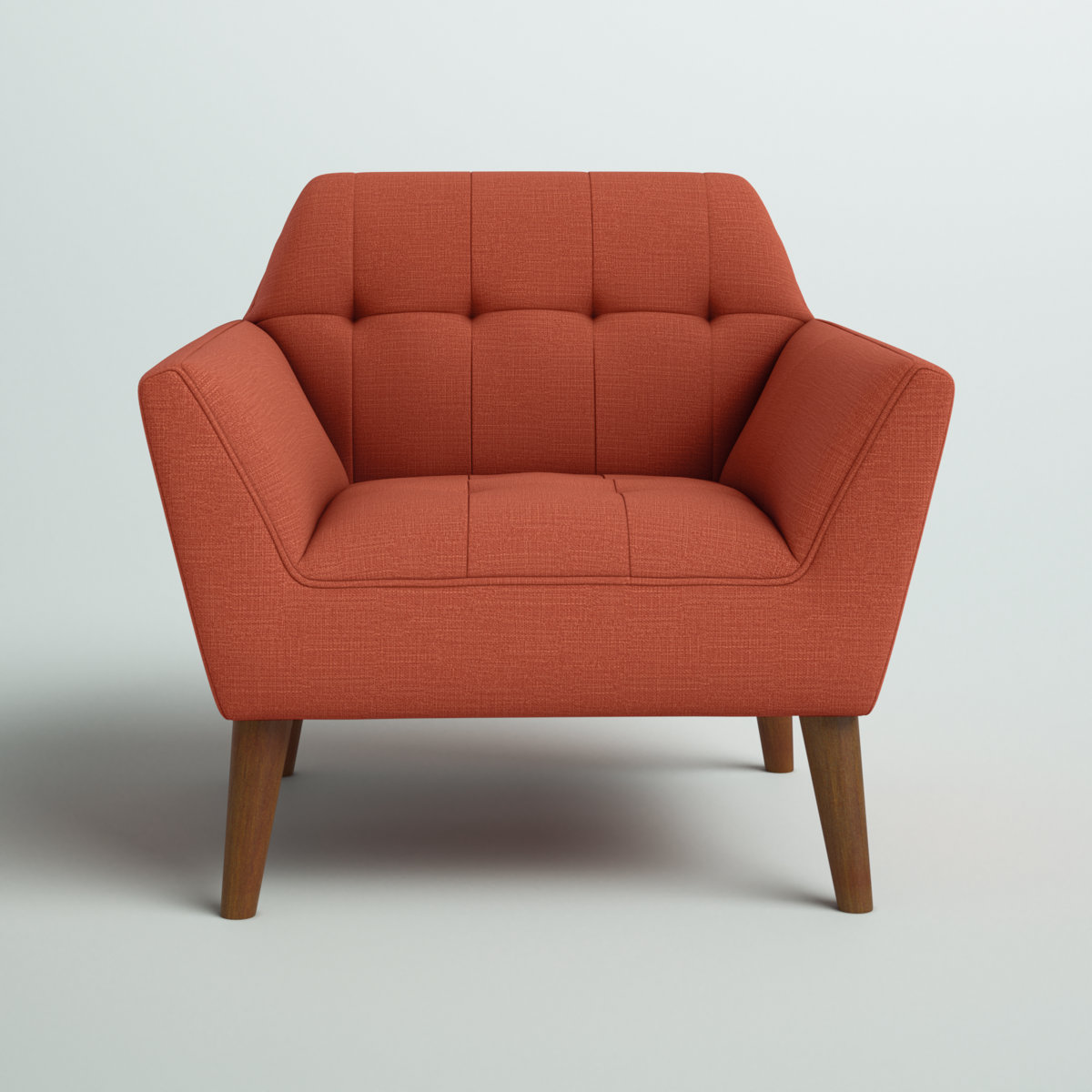 This armchair brings boxy lines to your bedroom or living space. It’s made with a solid pecan wood frame, and rests on solid wood legs in a warm beige finish. Wrapped in 100% polyester upholstery, its foam-filled, sinuous spring cushions give you just the right amount of support and prevent sagging over time. It strikes an angular, hexagonal silhouette with flared arms and splayed legs for a mid-century modern feel. Button-tufted cushions add a tailored touch, effortlessly elevating your surrounding design scheme.