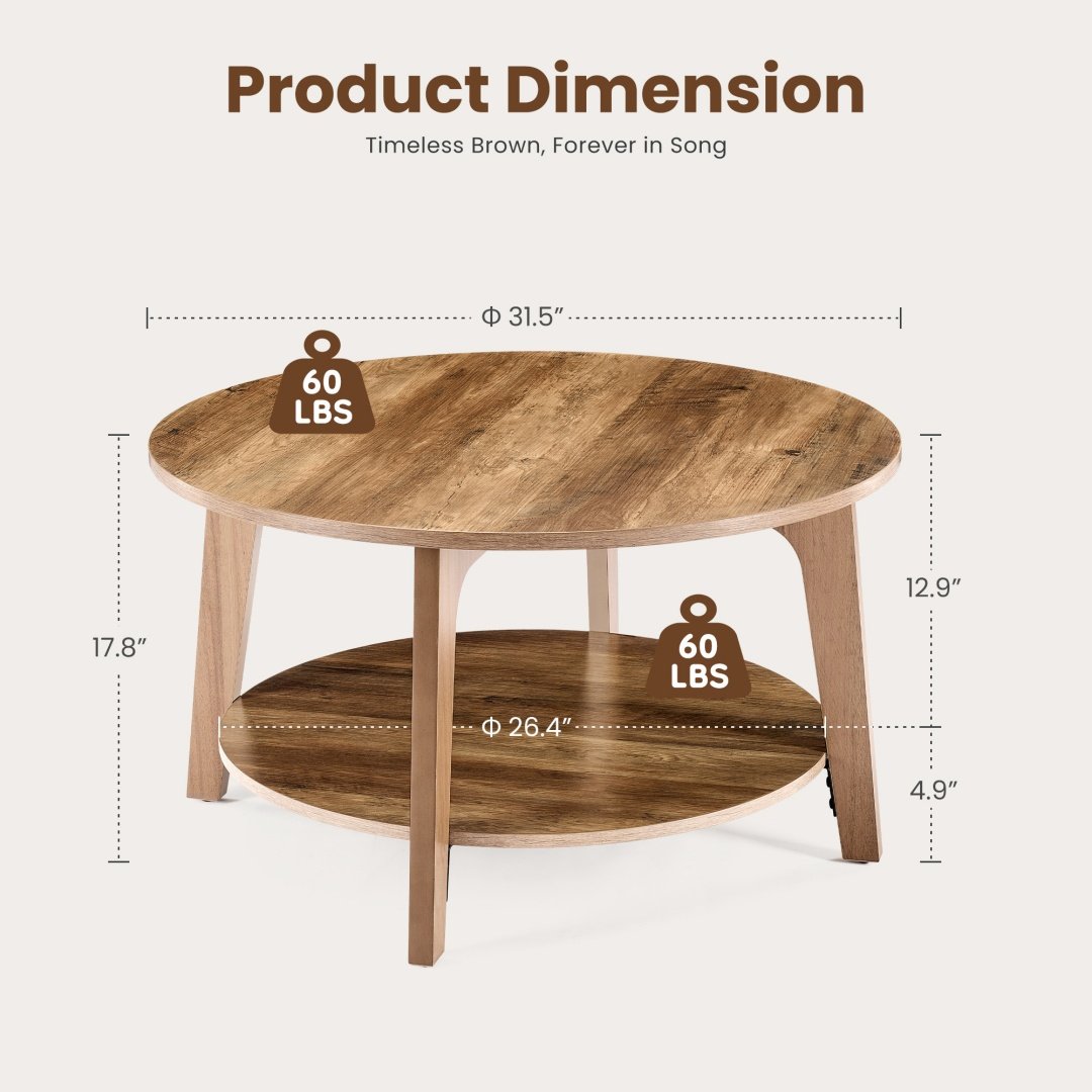 Dimensions Package Dimensions Product Weight Package Weight Product Code Style 31.50 x 31.50 x 17.76 inch 35.23 x 35.23 x 5.11 inch 31.04 lb 37.19 lb ZHUMI-CJ-Y32IN-BN Brown Large 2-Tier Storage Space: Featuring a wide 31.5” diameter tabletop and a 26.4” lower shelf, this round coffee table provides generous space for everything from coffee mugs and snacks to magazines and decorative accents. The two-tier design helps you keep the living room tidy while displaying your style.