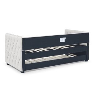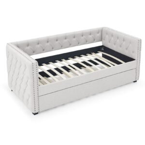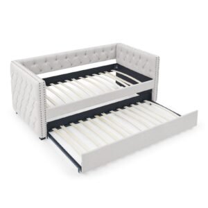 Upholstered Tufted Daybed With Trundle, Button & Copper Nail, Square Arms
