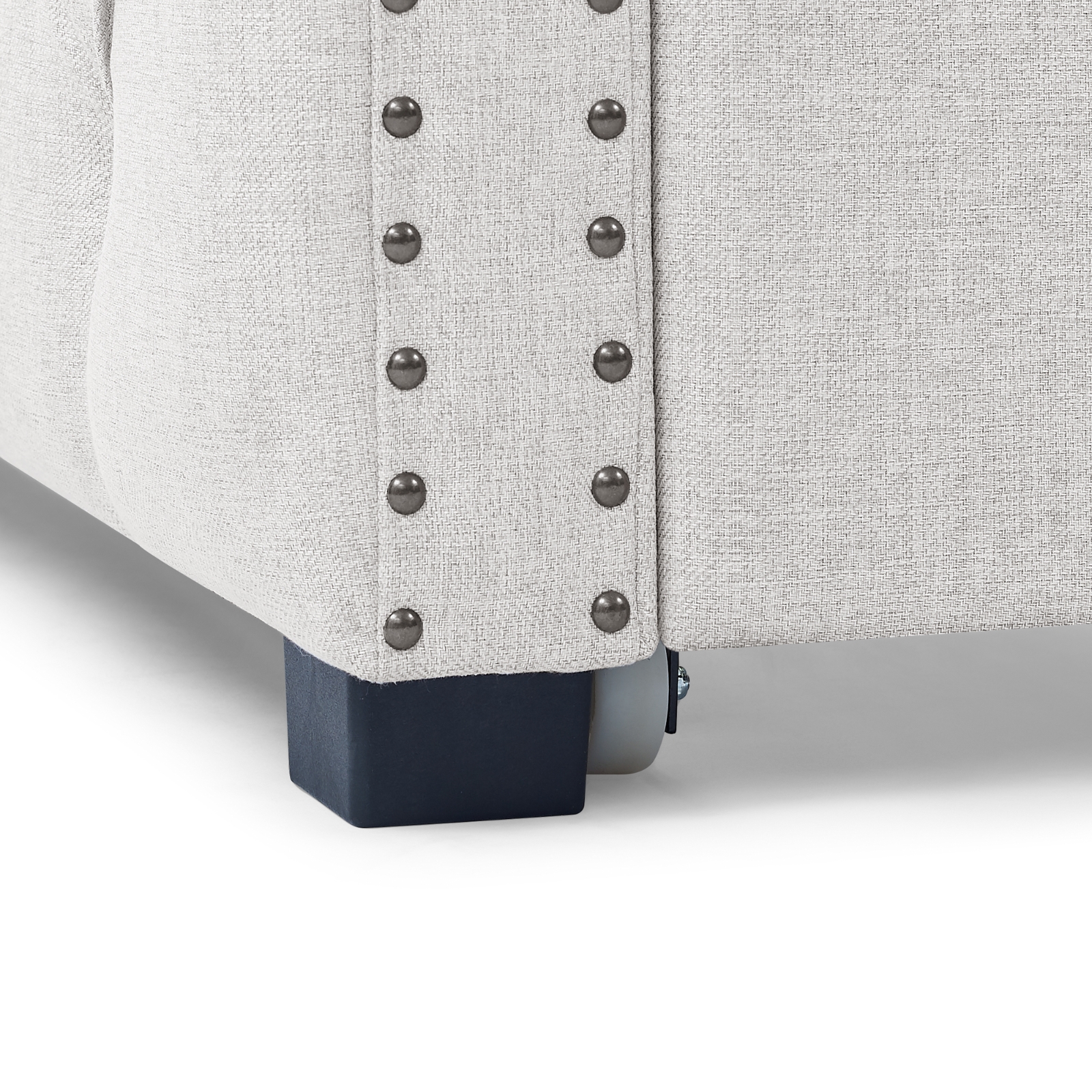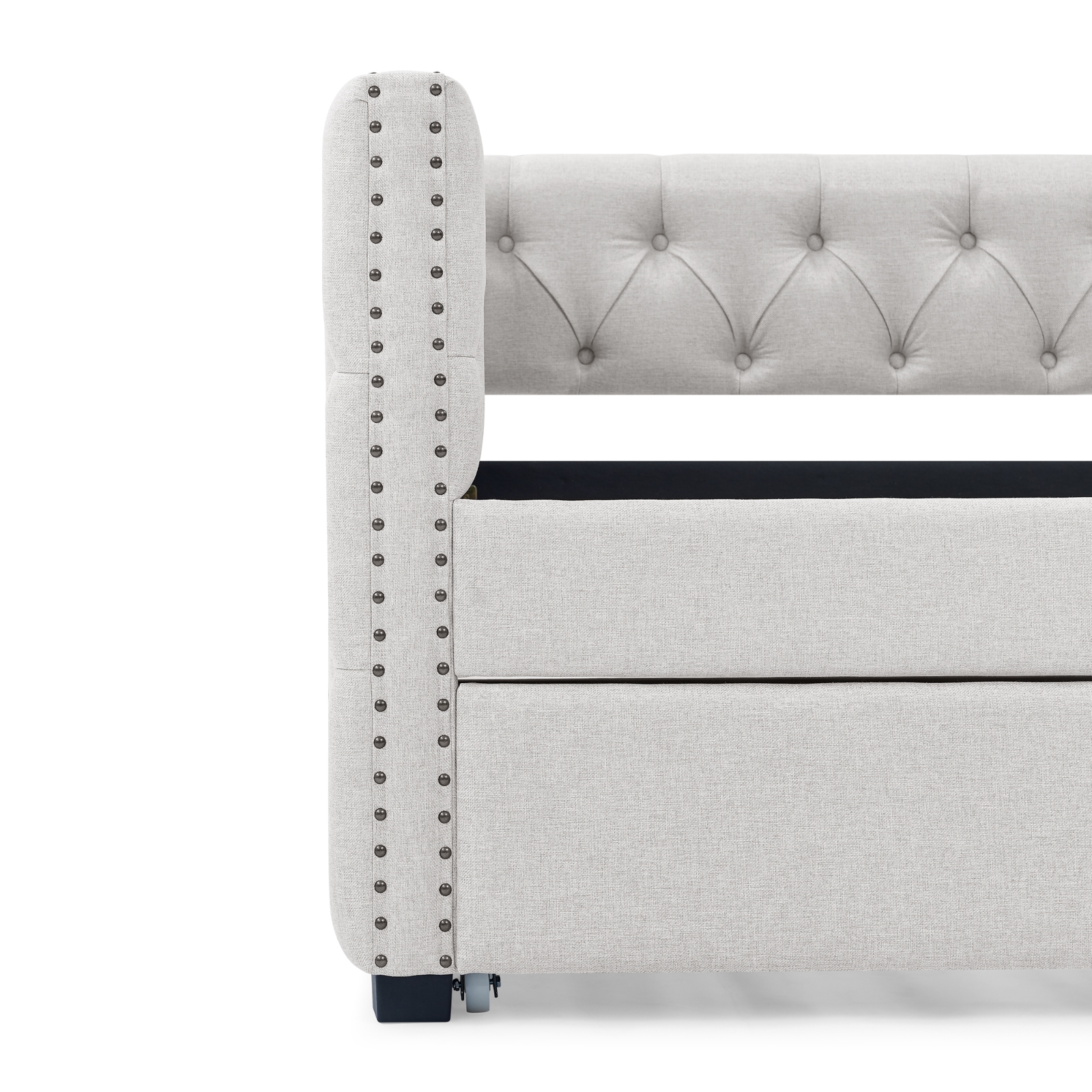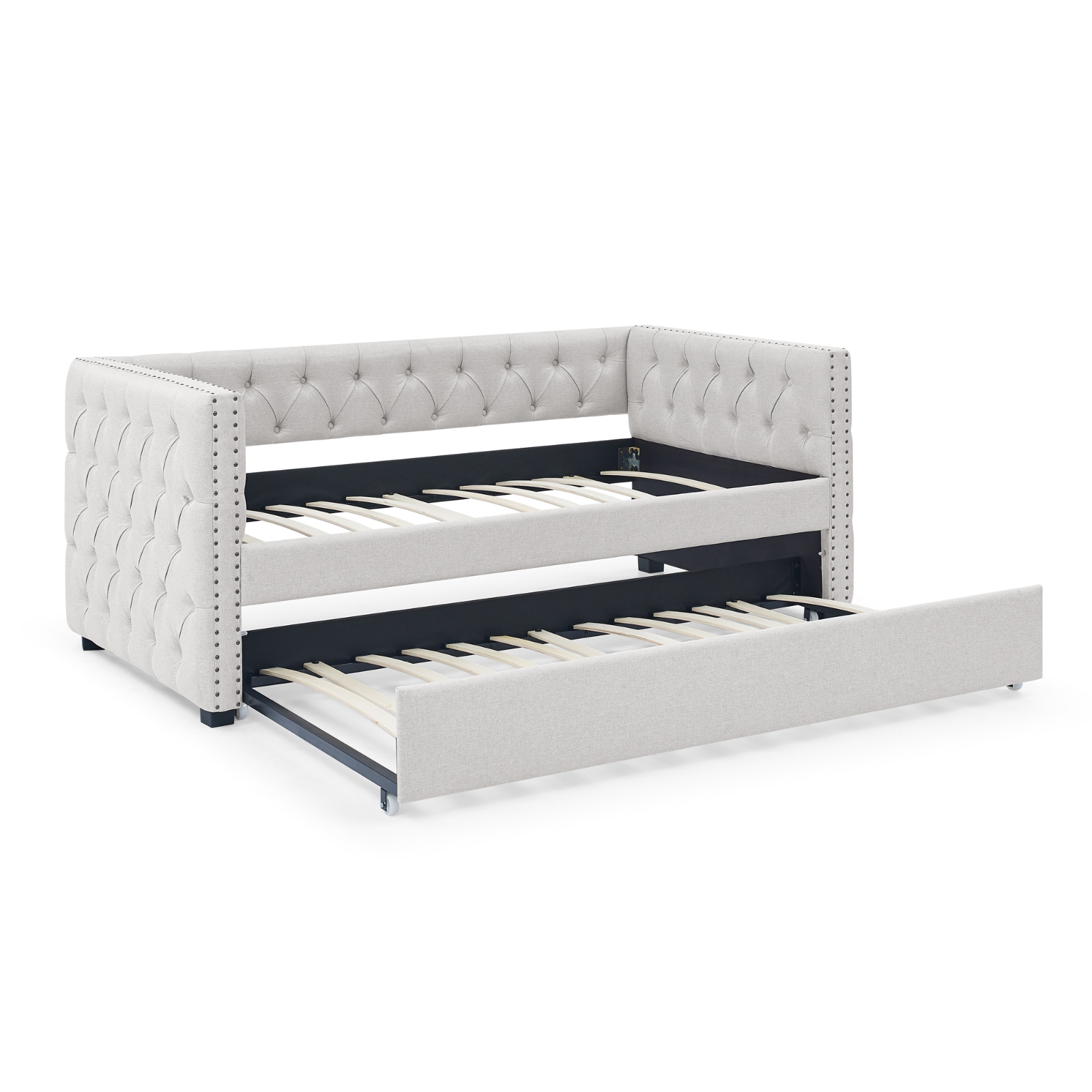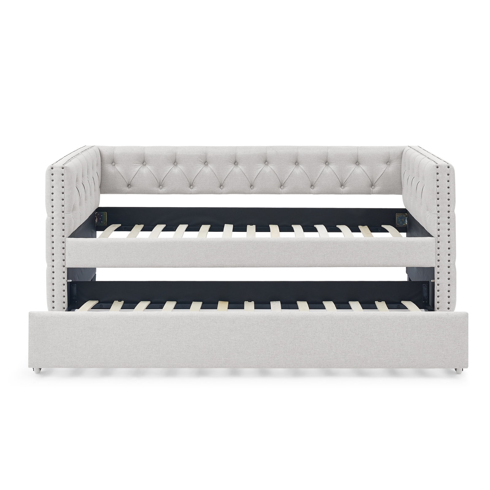 Upholstered Tufted Daybed With Trundle, Button & Copper Nail, Square Arms